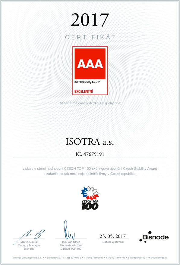 Вехой в нашей предпринимательской деятельности стал 2004г., когда мы приобрели производственные пемещения в Опаве с целью, после 12-летнего существования, разместить всю компанию в одном месте. В последующих годах наши усилия и старания принесли новые успехи. Мы поменяли юридический статус компании на ISOTRA a.s., экспортировали продукцию в 46 стран мира, начали изготовление наружных рольставней, москитьер, гаражных ворот и решеток, производство форм для впрыскивания термопласта. Крупные инвестиции были внесены в оборудование собственного инструментального цеха (обрабатывающие центры, станки с ЧПУ управлением для резки водяной струей и т.д.) и конструкторское бюро. Мы начали использовать современные 3D технологии, принимали активное участие в международных выставках в Европе и на иных континентах. Наши конструкторы разработали собственные станки для резки и полностью автоматические прокатные линии. Мы получили авторские права на 16 образцов и 6 изобретений. В сотрудничестве с VŠB – Техническим университетом Острава мы работали над созданием двигателя для электромобиля KAIPAN. Ассортимент нашей продукции обогатился широкой шкалой рулонных штор, наружных маркиз, screen-штор, мы разработали систему плиссе, включая возможность ее интегрирования в мансардные конструкции, и уникальные цепочные жалюзи TITAN. Кроме того, мы начали применять технологию обработки поверхности DECORAL для декорирования алюминиевых профилей.